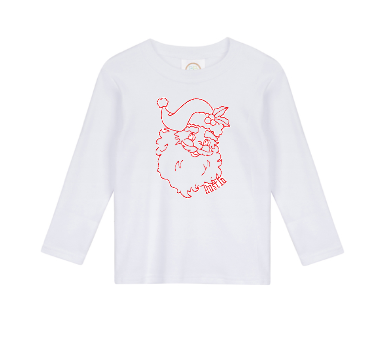 Vintage stitch Santa with your little one's name embroidered on the bottom right. Santa will be stitched in all white onto red garments, and stitched in all red onto white garments. Personalization is optional, but does not change the price. Please type “No Name” in the box if you would like the design only.