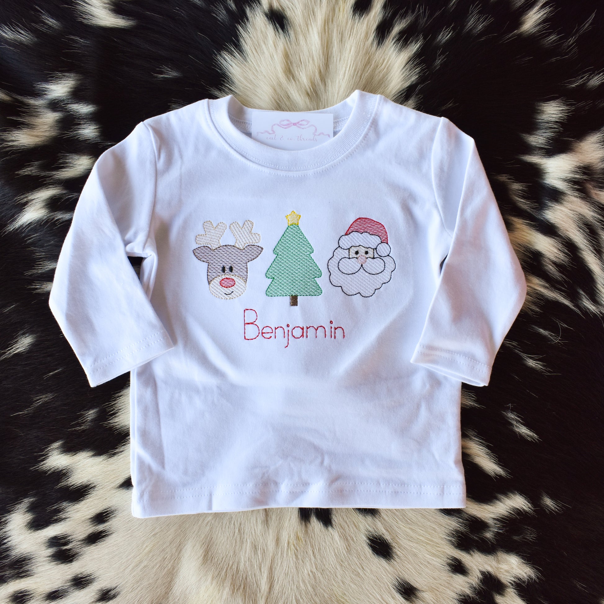 Christmas trio design including Rudolph, a Christmas Tree and Santa, with your little one's name embroidered underneath. Color of name may be adjusted depending on the color of the garment. Personalization is optional, but does not change the price. Please type “No Name” in the box if you would like the design only.