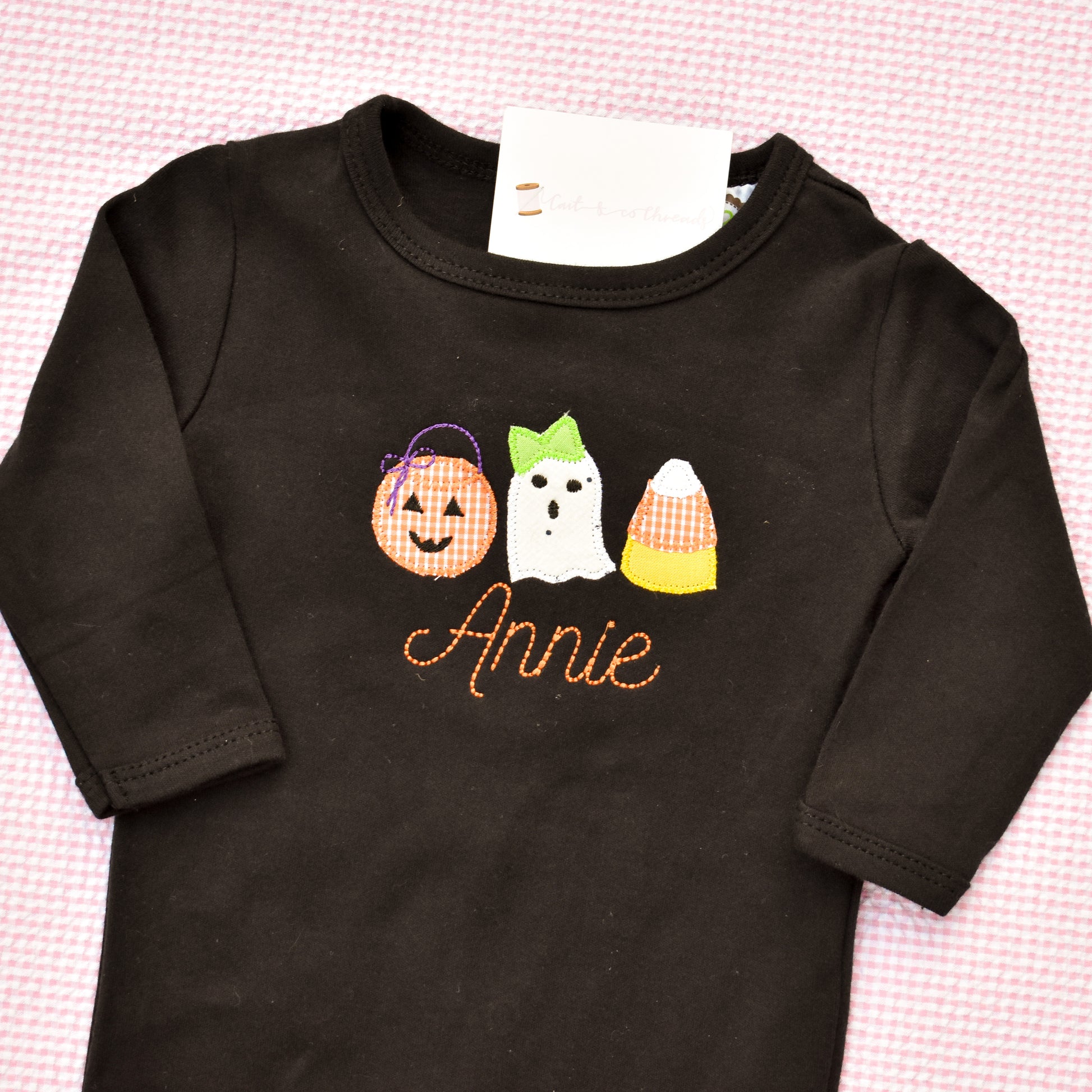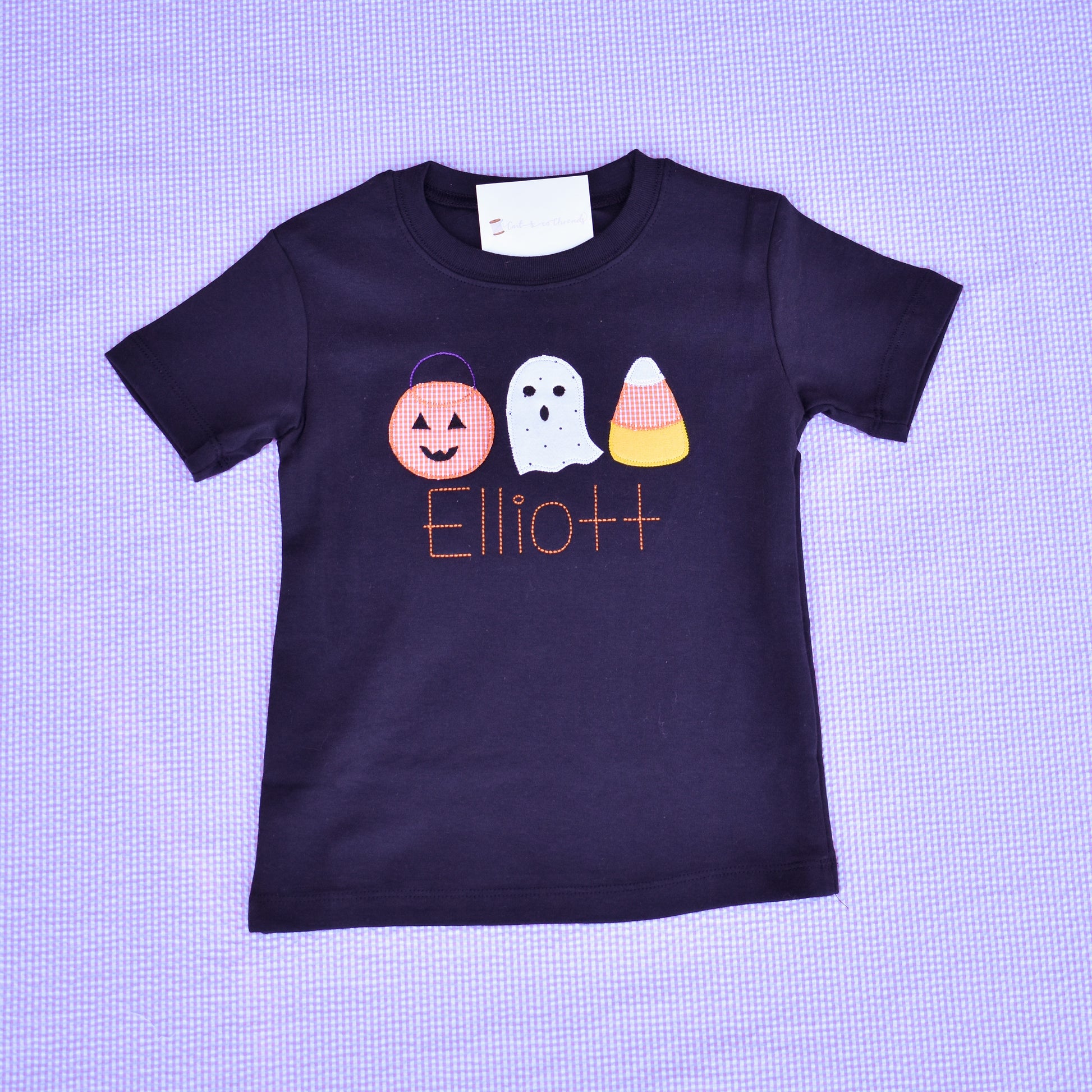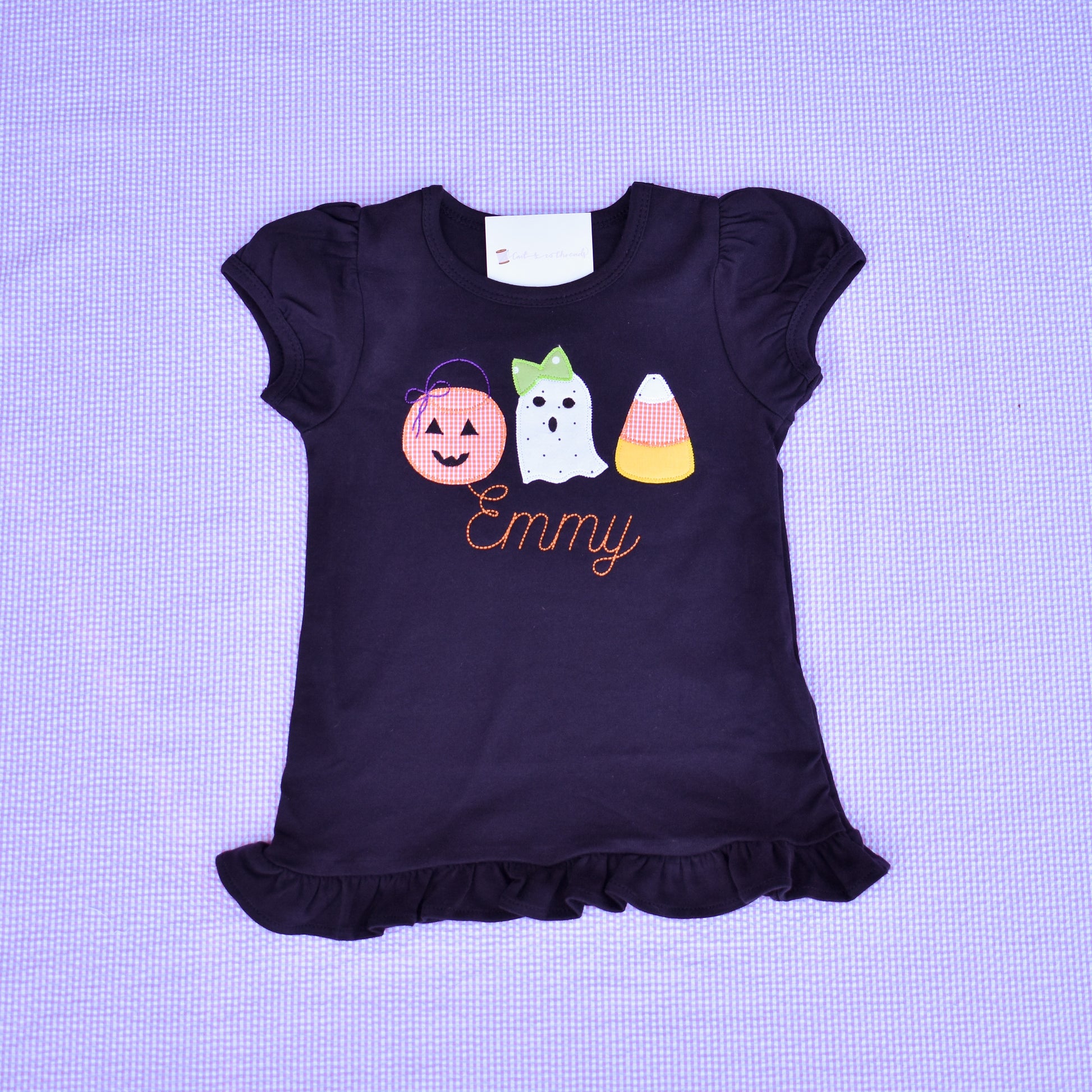 The cutest Halloween trio stitched onto a black or white tee. Design can be done with bows on the pumpkin and ghost, or without bows, as shown in the third photo. Fabrics on final garment may differ from the photo shown here.