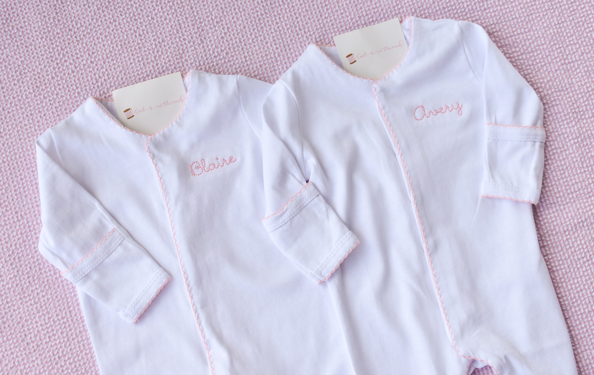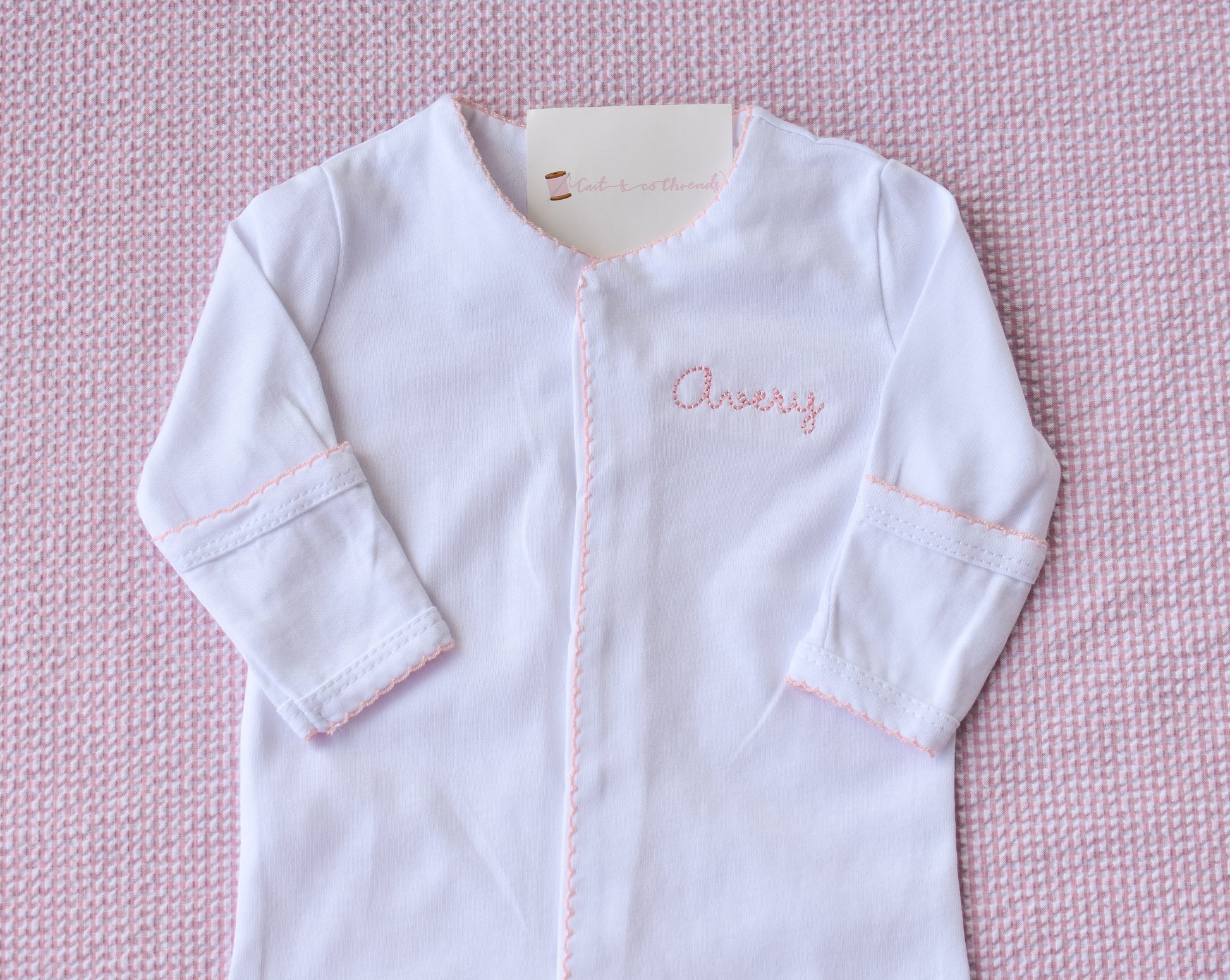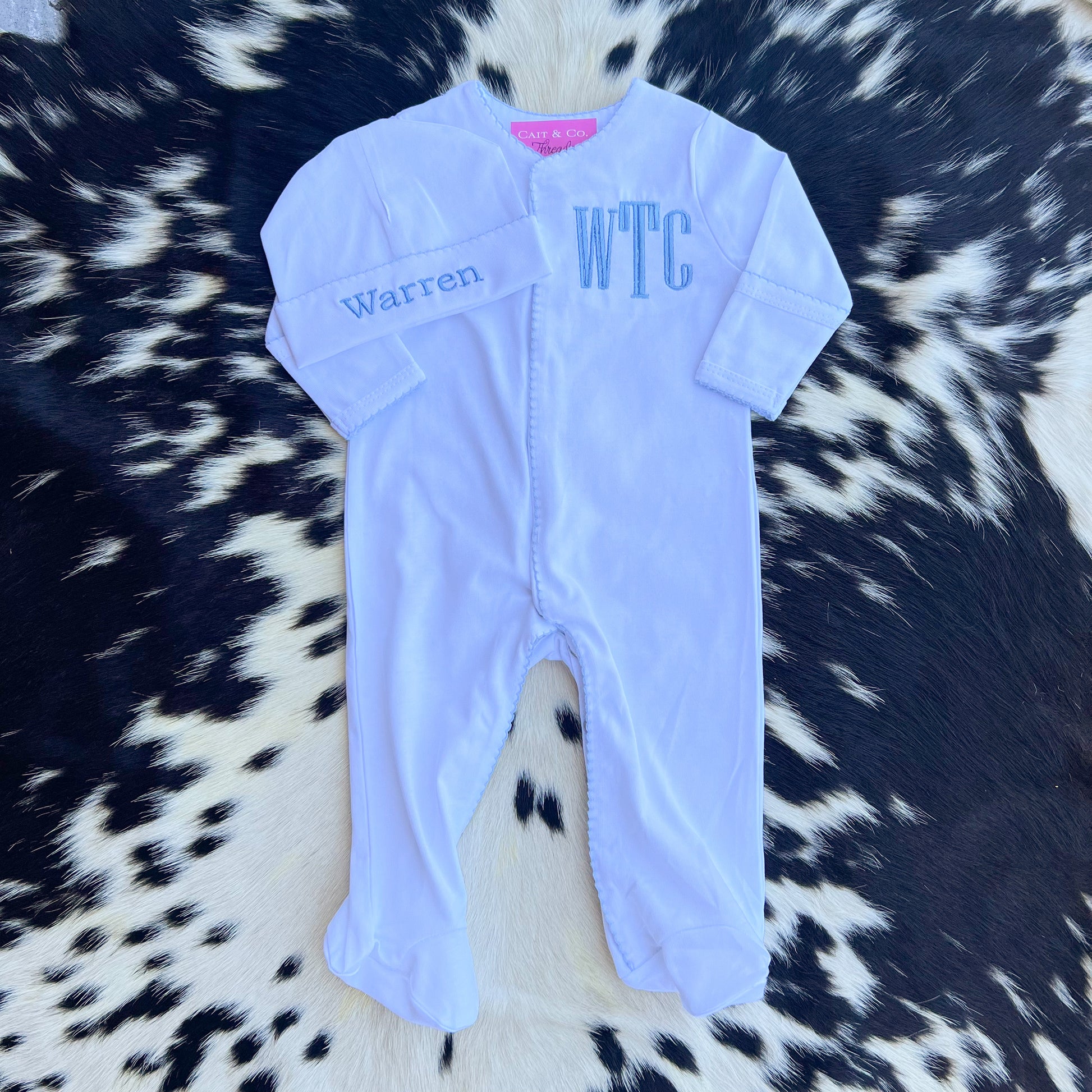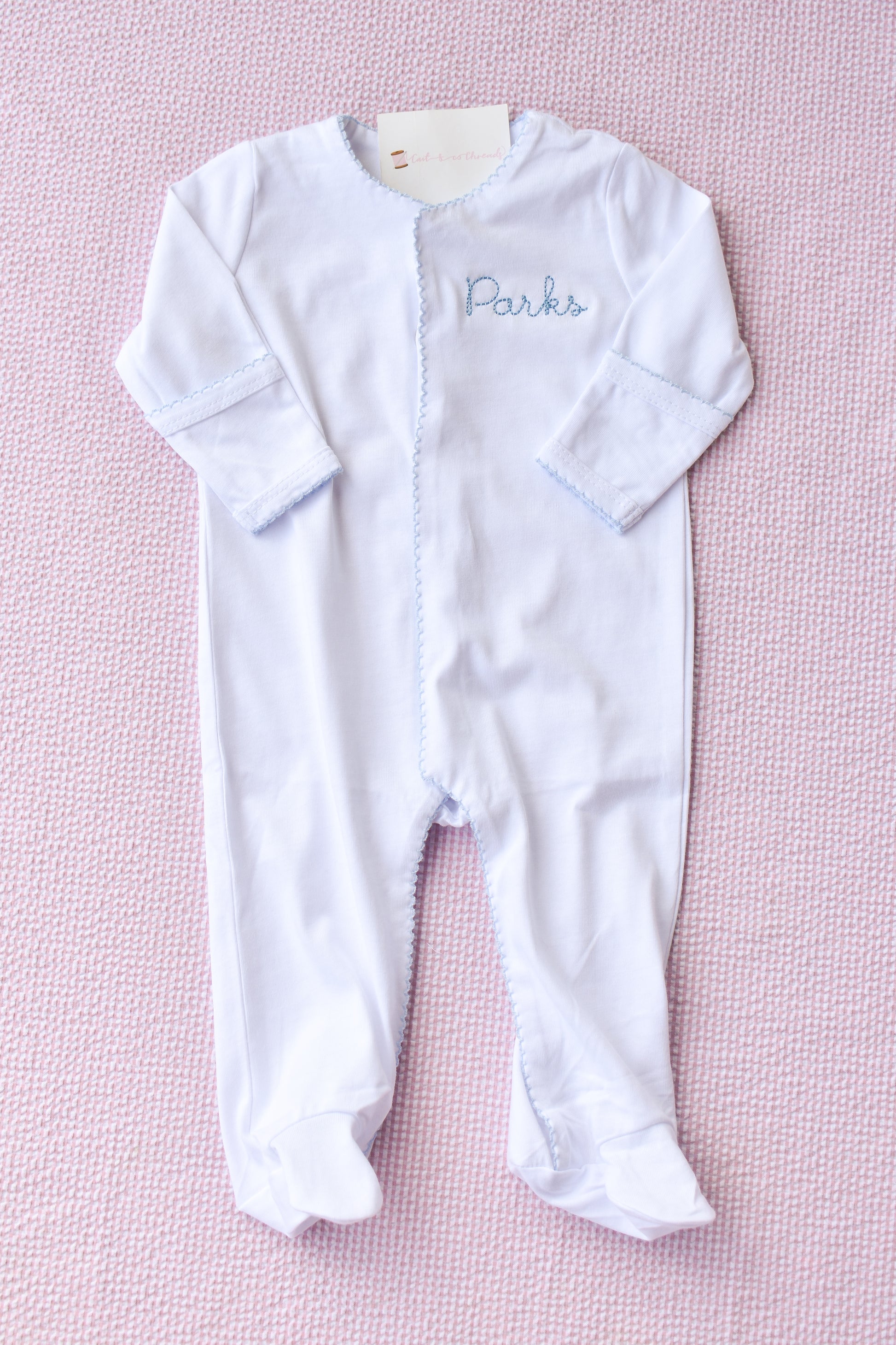 This premium pima cotton footie with picot trim is the perfect outfit for bringing baby home or taking newborn photos. Color options include baby pink and baby blue. Personalize with a monogram or name. Embroidery included in price. Hat sold separately.