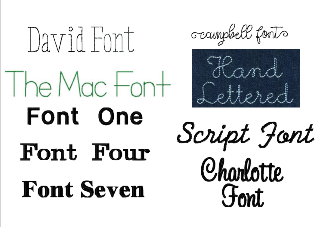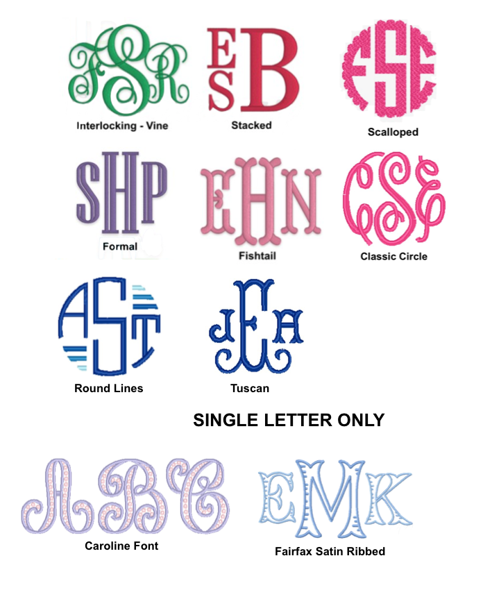 "Parks", "Avery", and "Blaire" are done in "Hand Lettered" font. If the font you have chosen does not work with the length of the name or monogram you will be contacted. Thread color will match the picot trim.