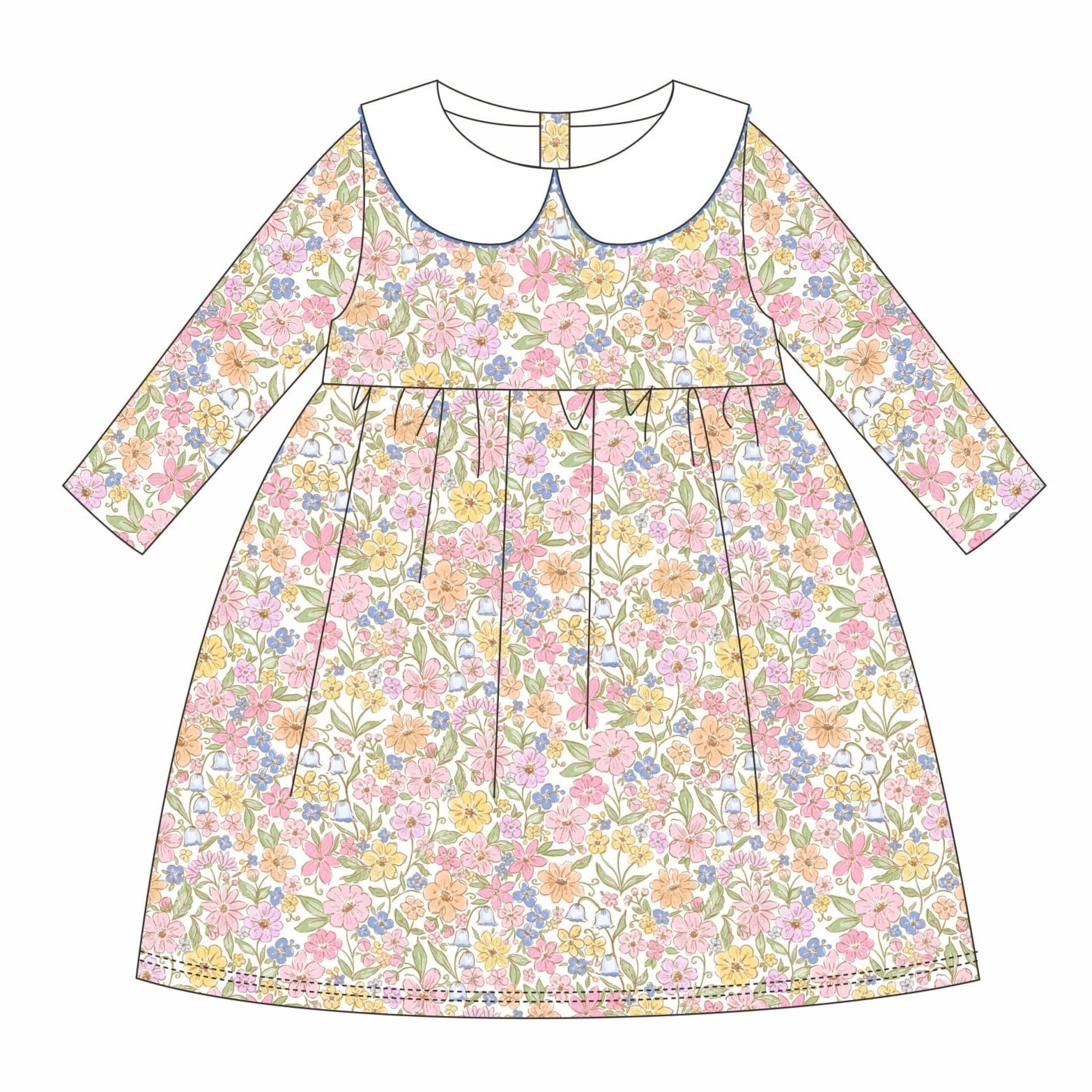 Jellybean Vintage Floral Charlotte Dress. A super soft knit: 95% Cotton 5% Spandex. Fits true to size. I recommend a thicker font like Ellie Mae, Charlotte, or Harriet Fill for names and Fishtail or Scalloped for monograms.