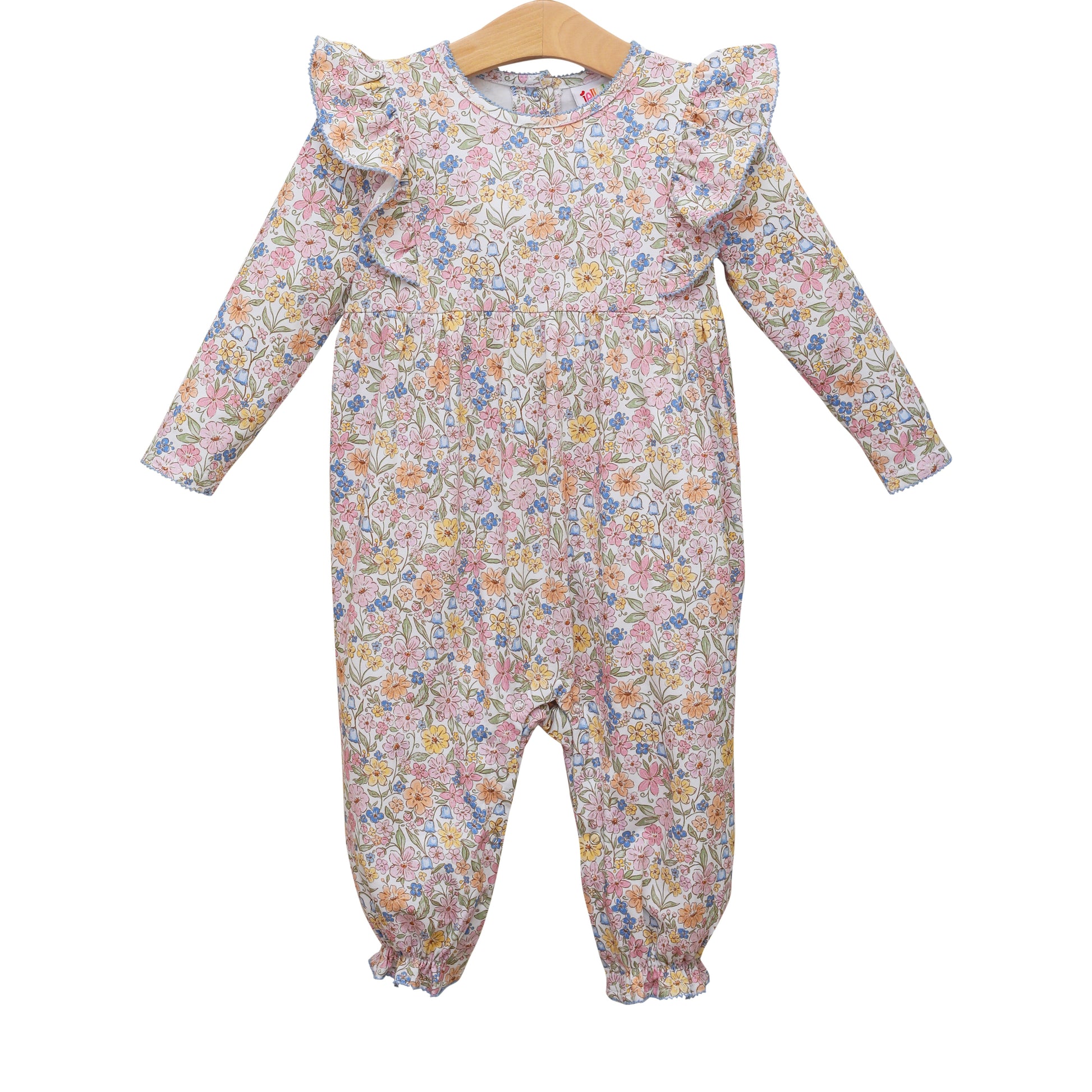 Jellybean Vintage Floral Flutter Romper. A super soft knit: 95% Cotton 5% Spandex. Fits true to size.