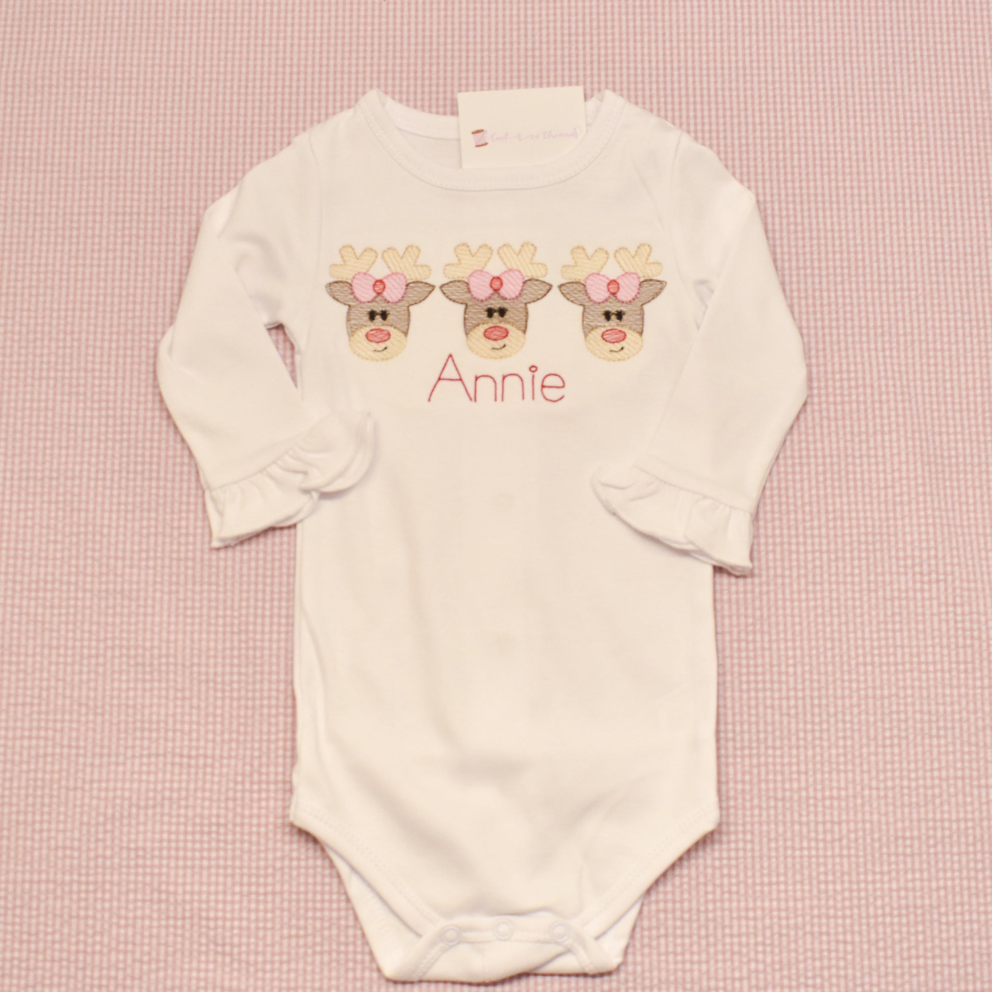 Three reindeer with bows with your little one's name or initials embroidered underneath. Color of name may be adjusted depending on the color of the garment. Personalization is optional, but does not change the price. Please type “No Name” in the box if you would like the design only.