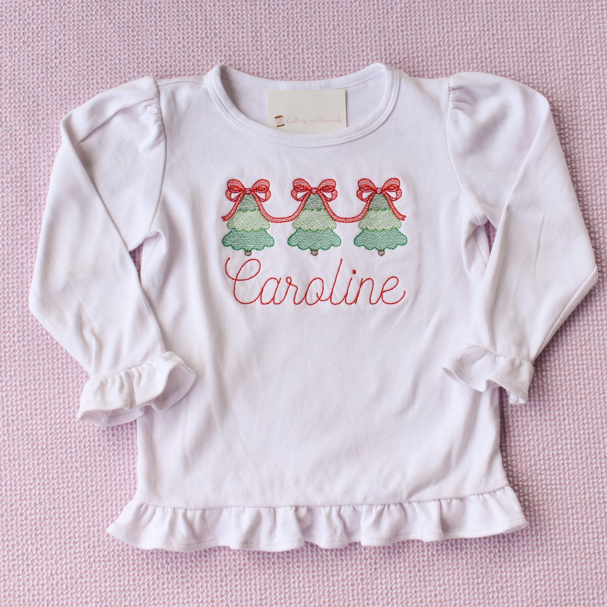 Three Christmas trees topped with bows with your little one's name embroidered underneath. Colors may be adjusted depending on the color of the garment. Personalization is optional, but does not change the price. Please type “No Name” in the box if you would like the design only.