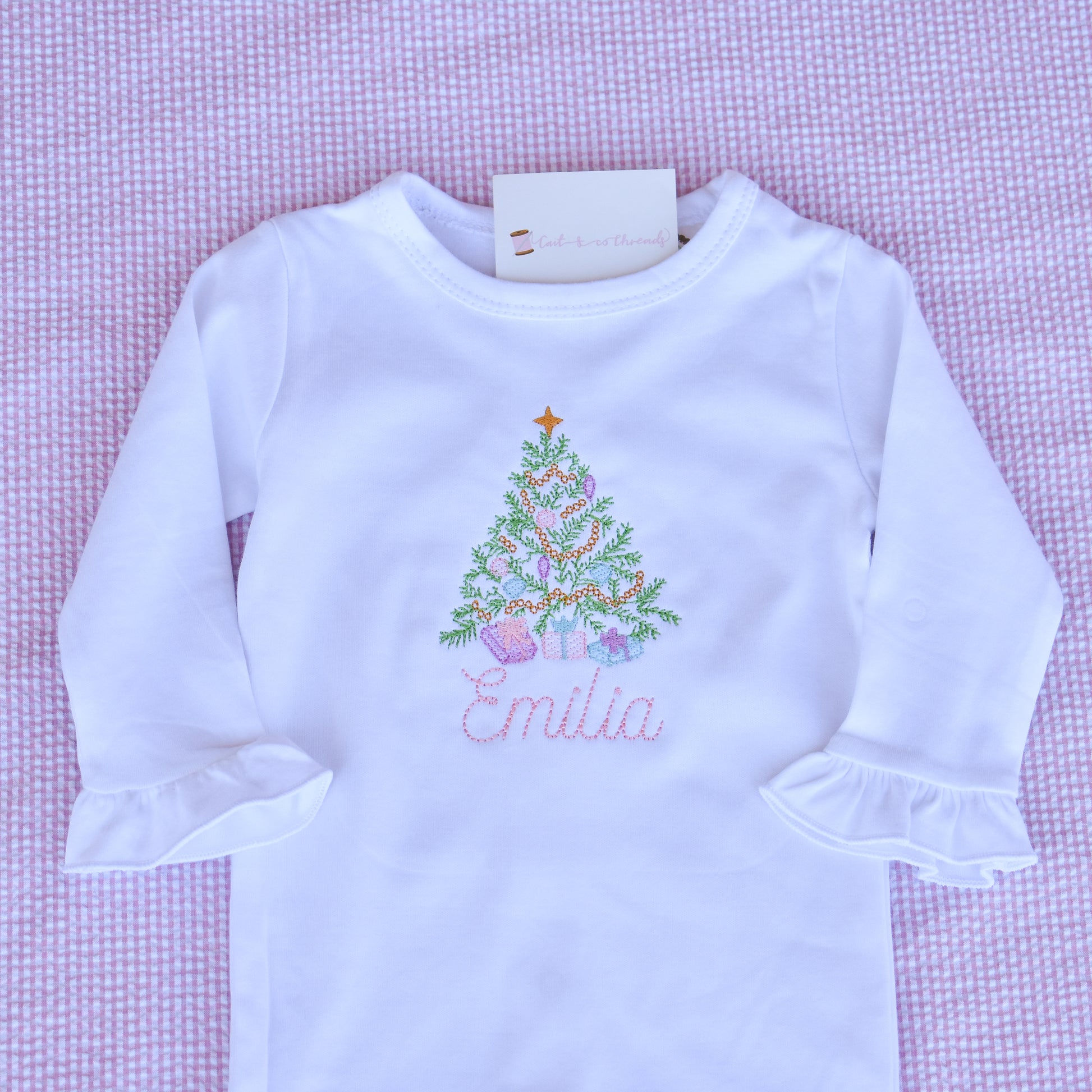 Vintage stitch Christmas tree with presents with your little one's name or initials embroidered underneath. Color of name may be adjusted depending on the color of the garment. Personalization is optional, but does not change the price. Please type “No Name” in the box if you would like the design only.